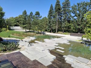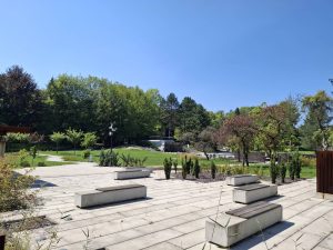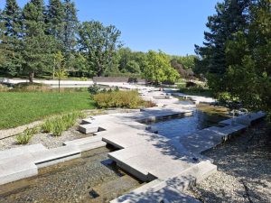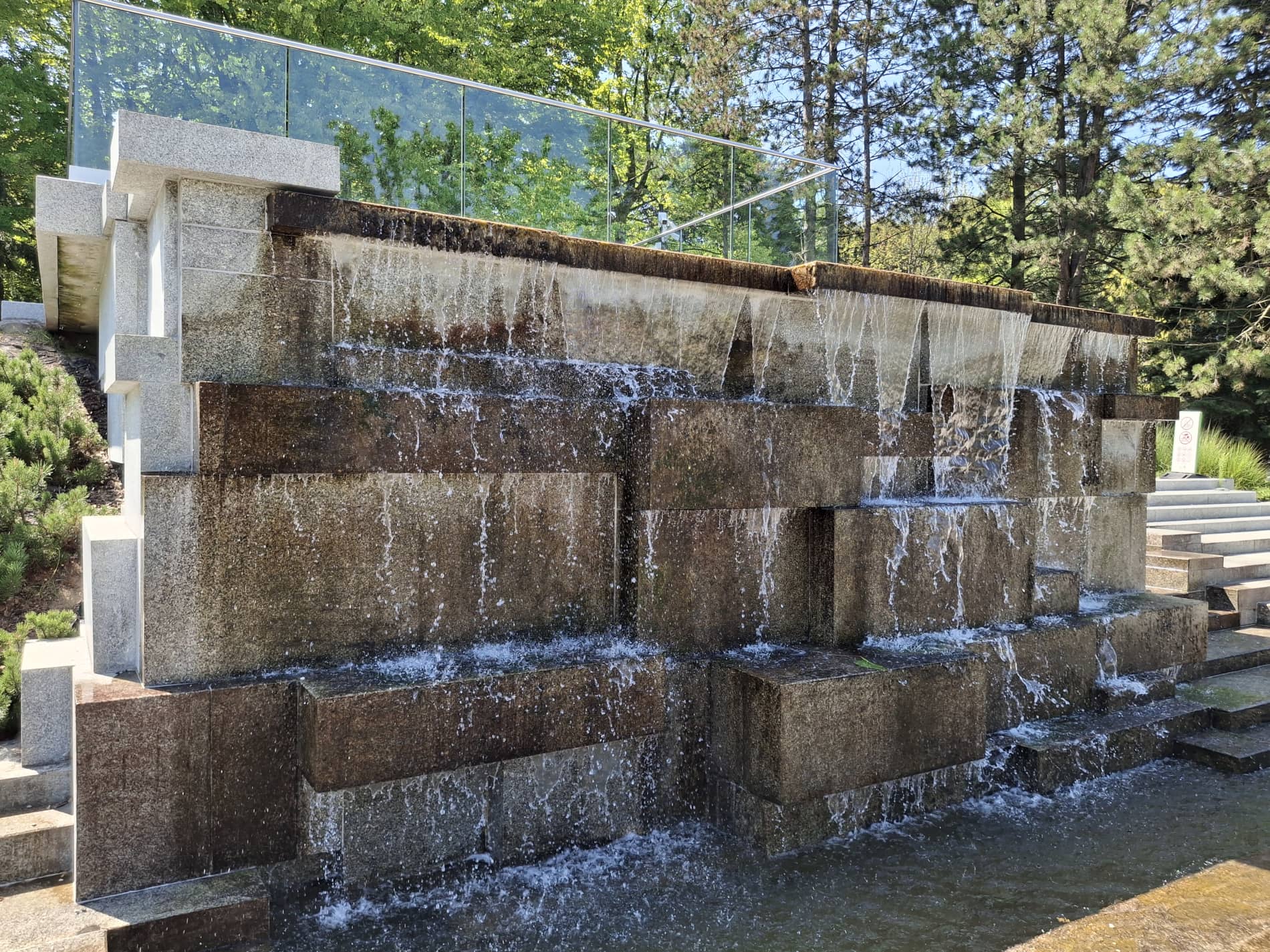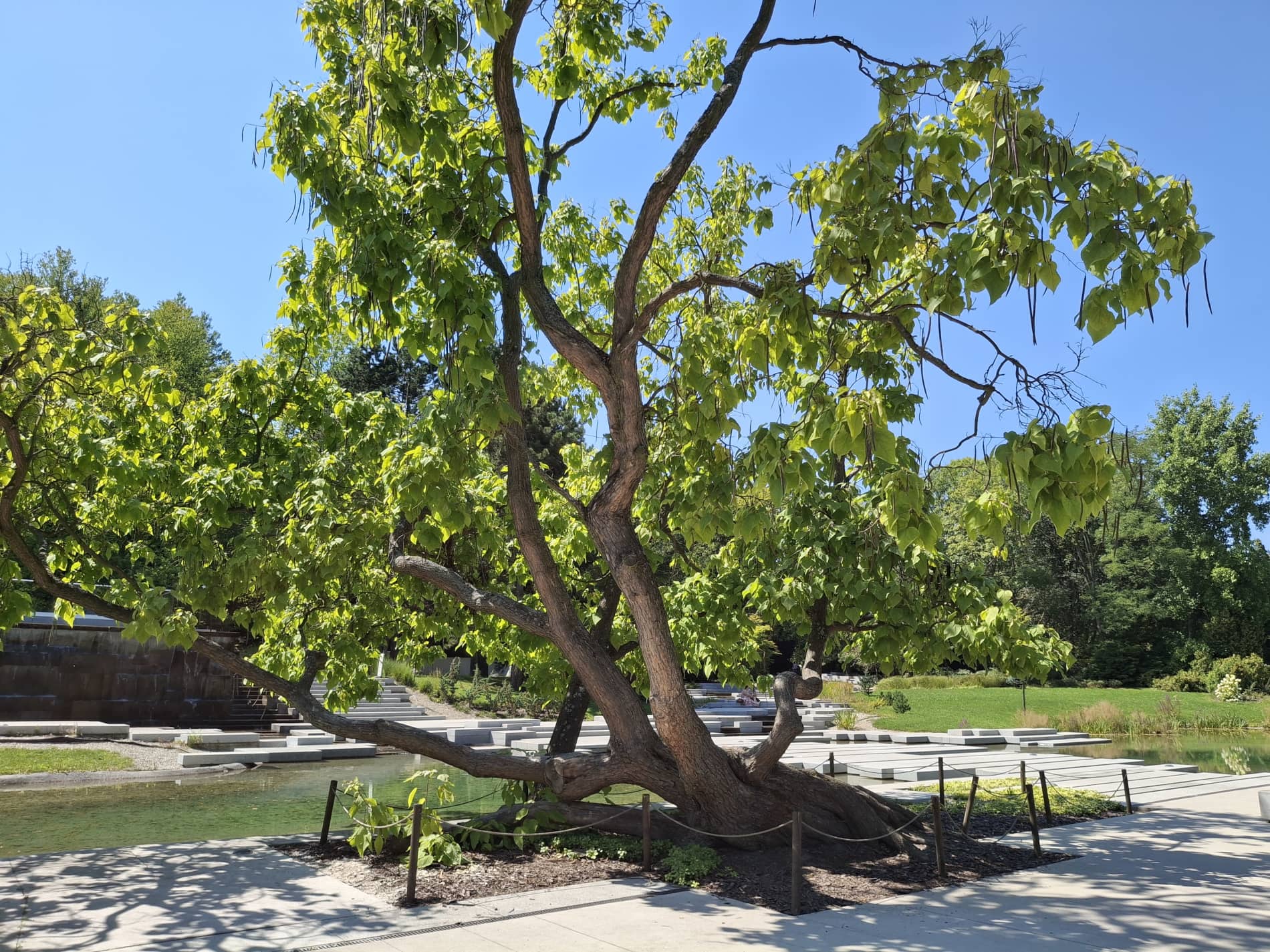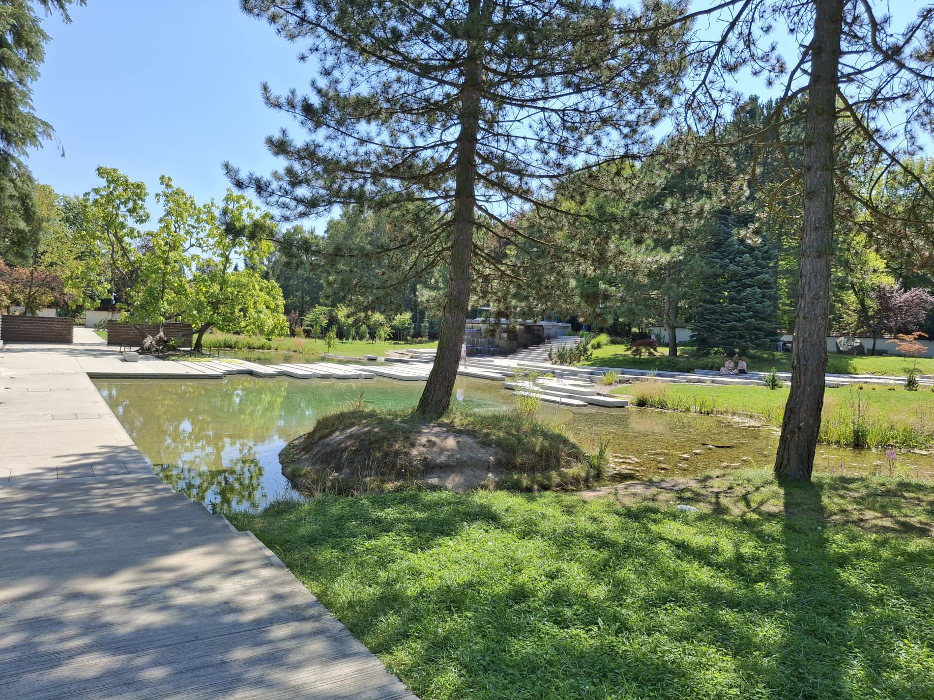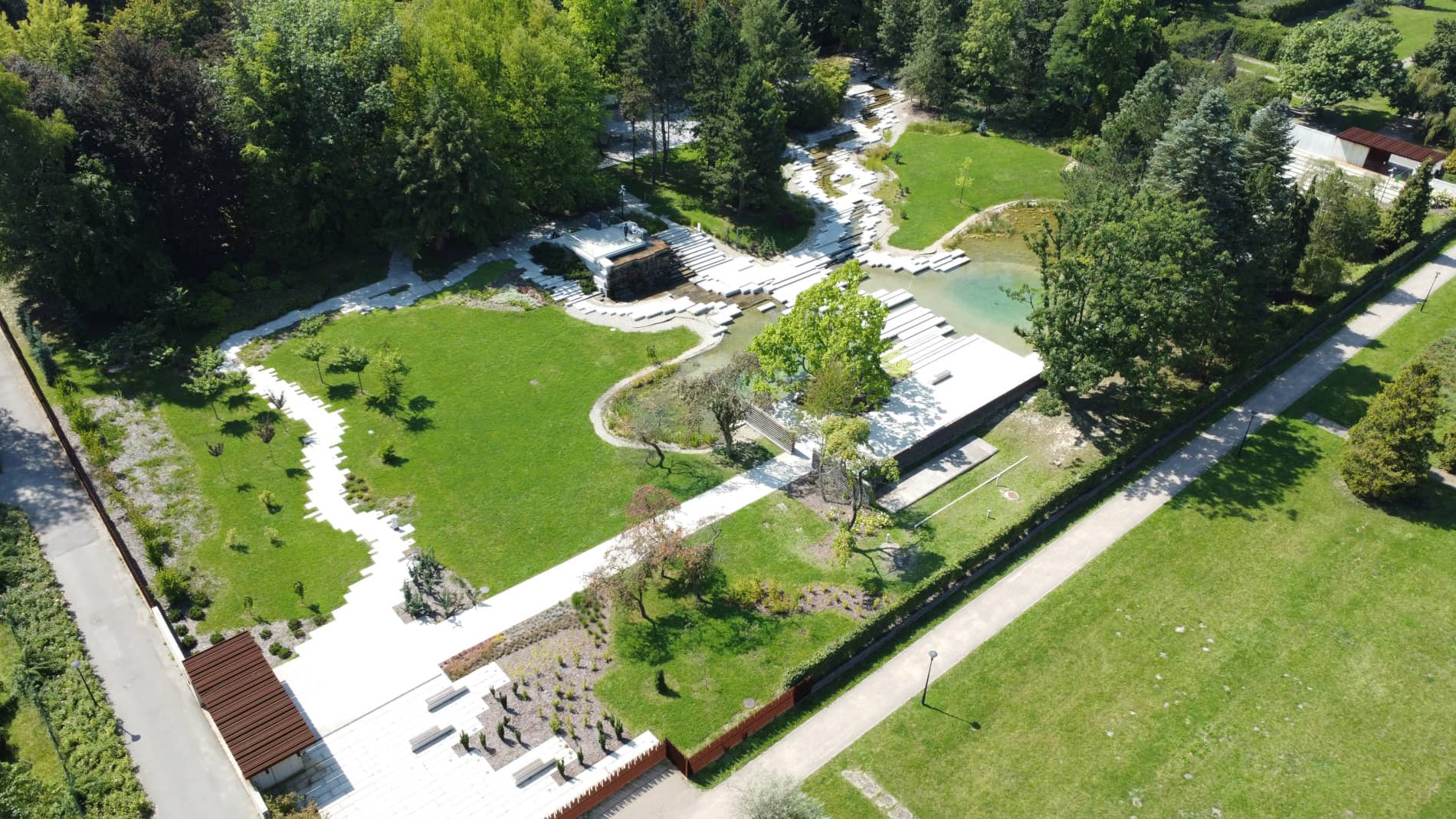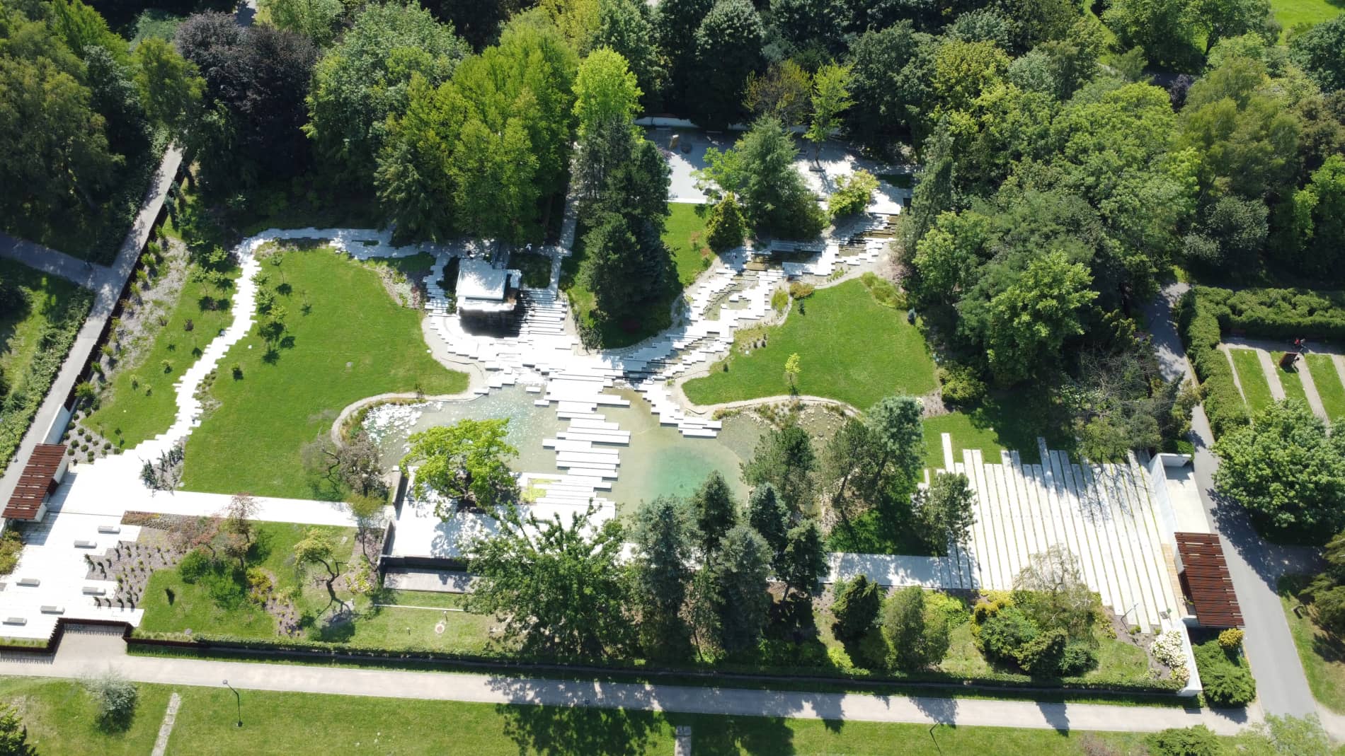 Centralna część Ogrodu jest właśnie „betonozą”. Między płytami znajdziemy dwa strumyki i staw, woda jest dosyć czysta, stanowi obieg zamknięty i jest filtrowana, więc nie ma w niej ryb. Głównym punktem jest przeszklona platforma widokowa, obok której umiejscowiono kaskadową fontannę, z której wypływa woda. Na platformę można dostać się schodami, lub windą. Po obu stronach stawu są łąki z nielicznymi krzewami i drzewkami. Tylna (południowo-zachodnia) część Ogrodu jest bardziej zacieniona i zadrzewiona. Znajdziemy tam żwirowy Ogród Zen z charakterystycznymi kamieniami, a także miejsca do siedzenia.