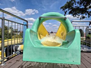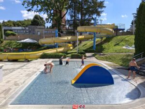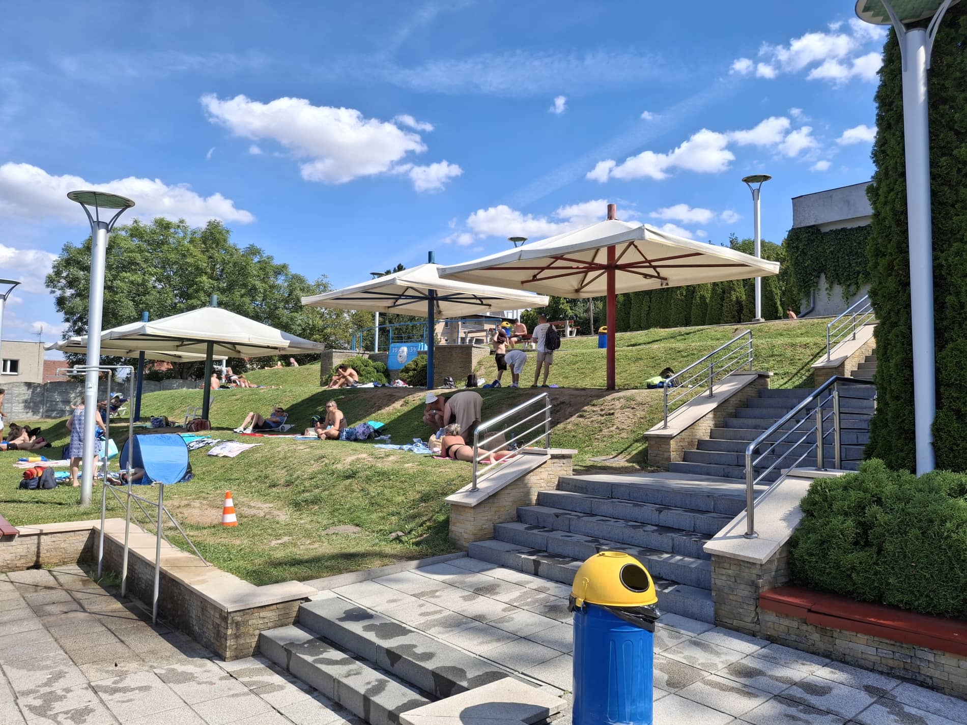 Na zewnątrz basenów jest nawierzchnia z gładkich, betonowych płytek, a wokół niej trawiasta „plaża”, na której rozłożonych jest kilka dużych parasoli. Ponadto w okolicy jest kilka drzew, dających cień. Teren jest nieco pofałdowany, przez co „plaża” znajduje się znacznie wyżej, niż baseny, a na obiekcie nie brakuje schodków.
