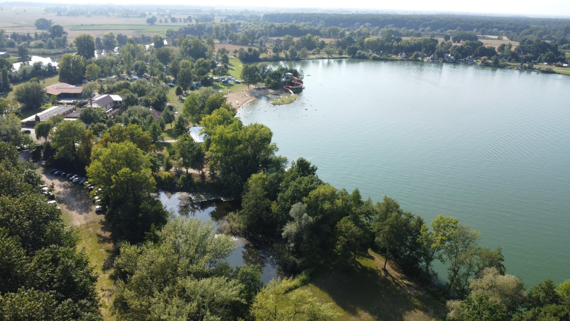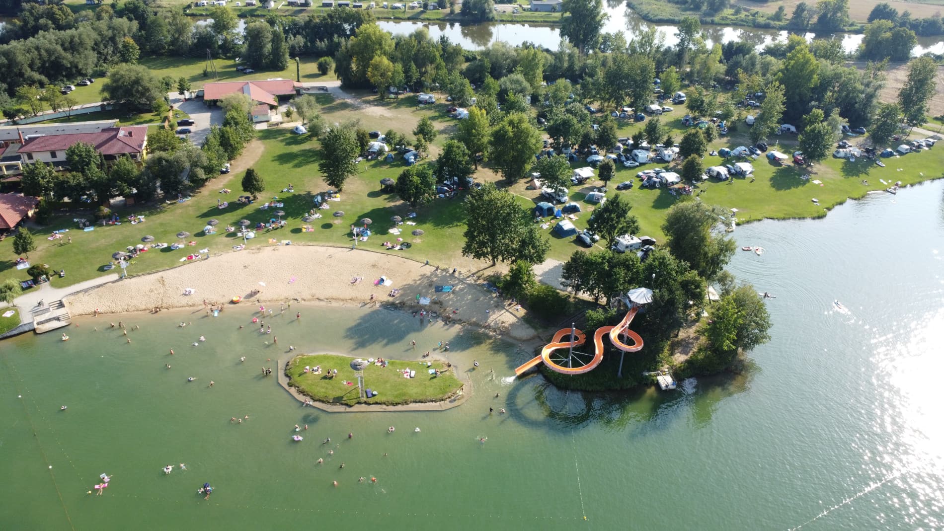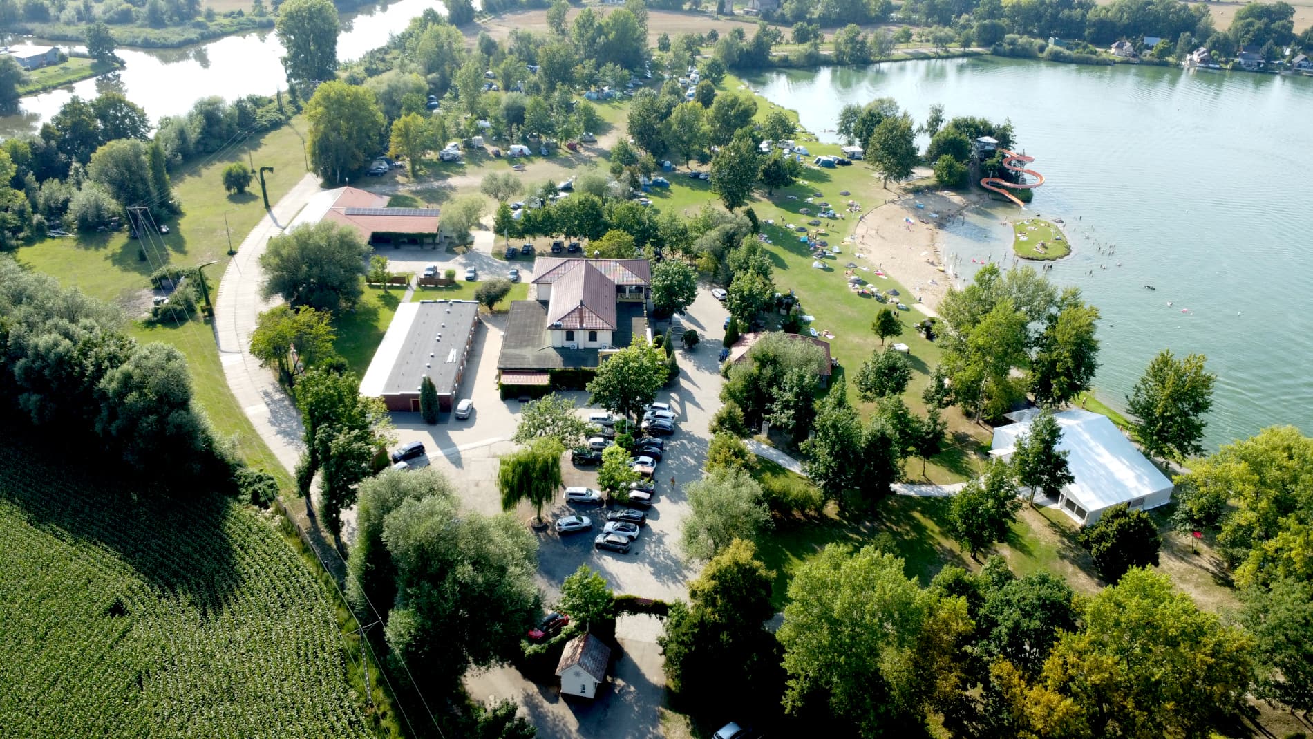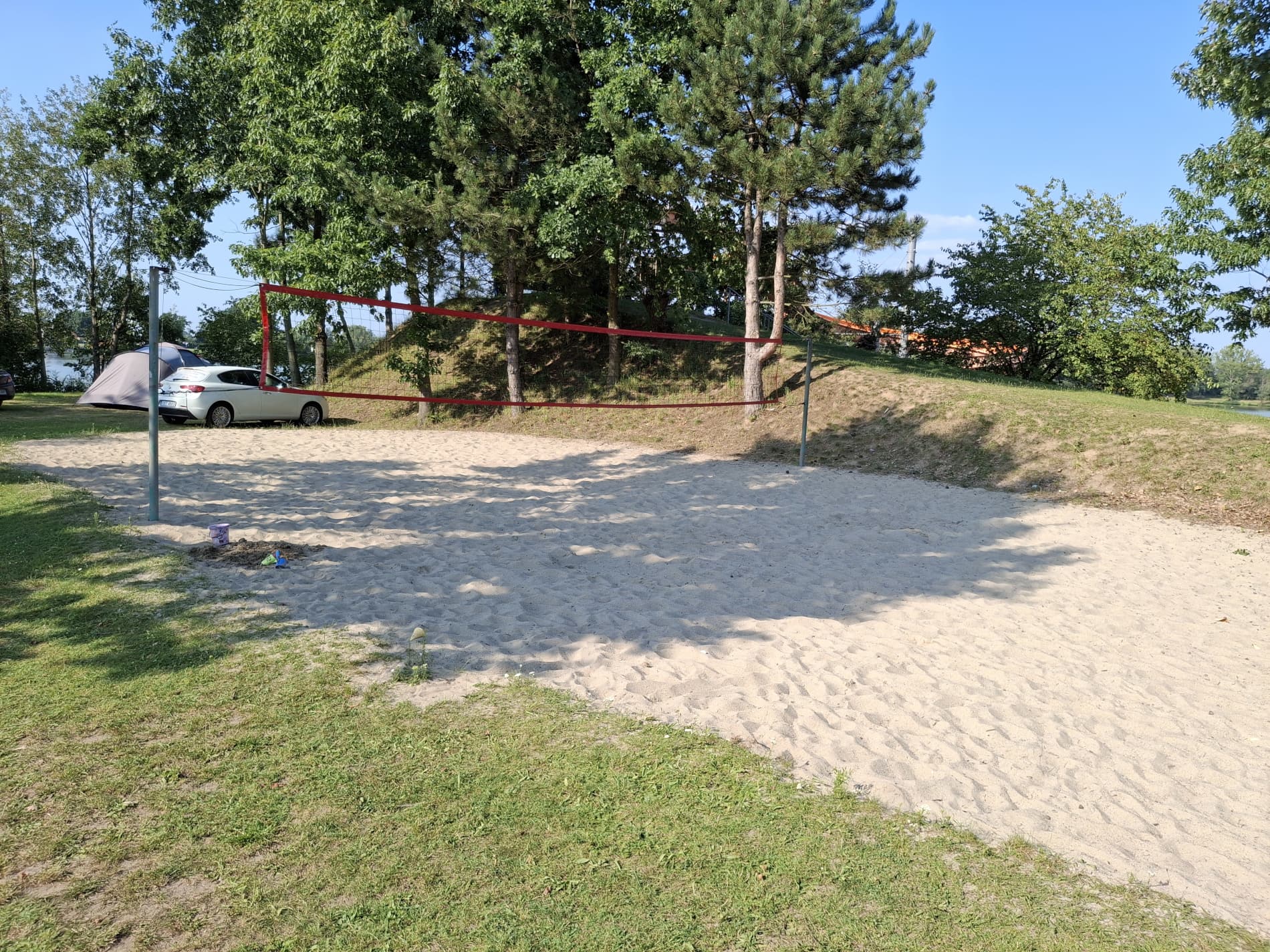 Na tyłach plaży jest boisko do siatkówki plażowej. Południowo-zachodnia część ośrodka to duże pole namiotowo-kempingowe, a przy nim kolejna, nieoficjalna plaża, służąca do okazjonalnych kąpieli oraz wypływania deskami SUP. W cenie wstępu do ośrodka jest: korzystanie z kąpieliska i zjeżdżalni, toalet i zlewozmywaków. Cała reszta jest dodatkowo płatna: noclegi, namioty, śmieci, prąd, wędkowanie, pływanie na własnym sprzęcie, czy też kiepskiej jakości prysznic na żetony. Cały teren ośrodka jest wysprzątany, a trawa przystrzyżona.