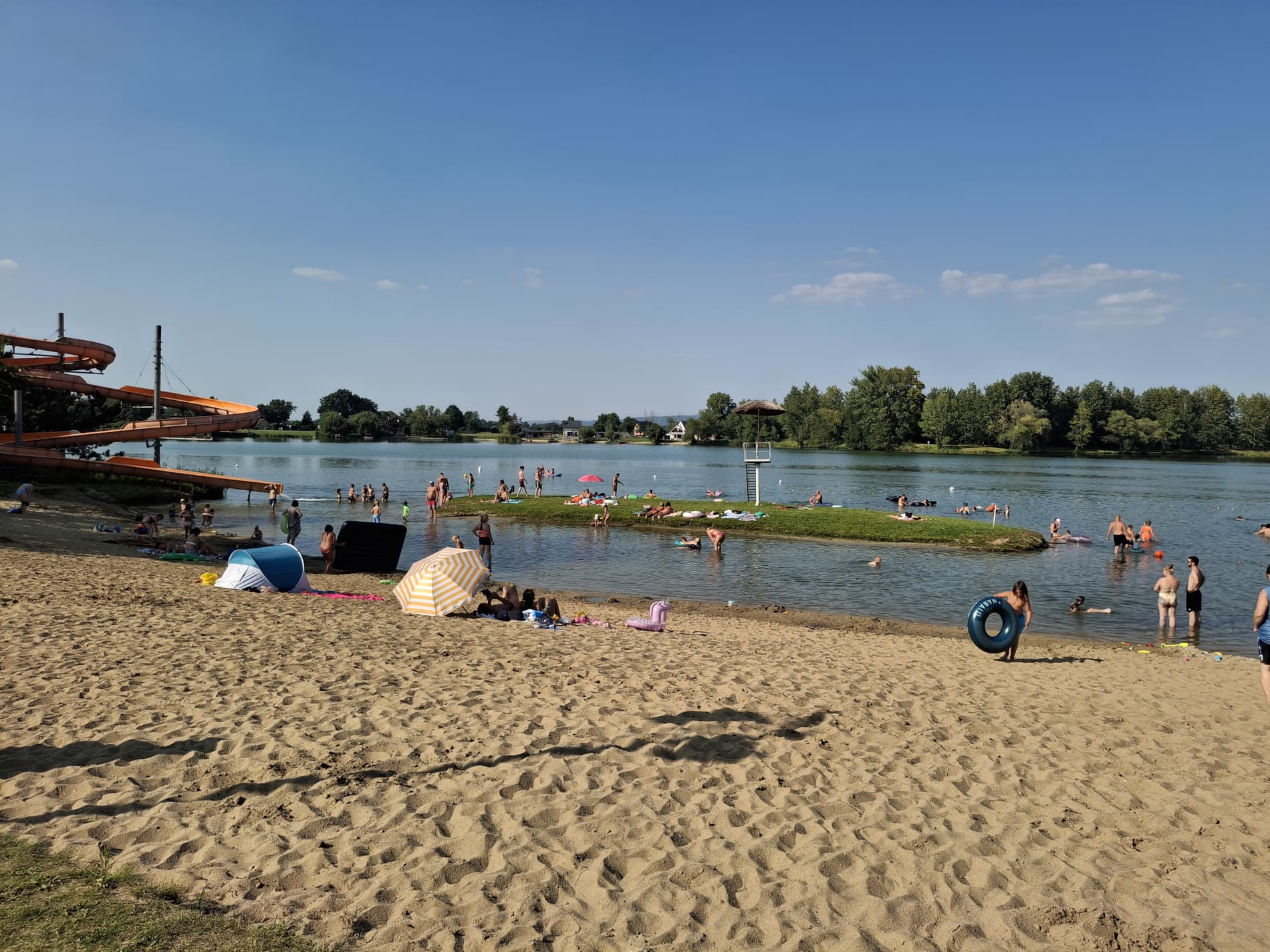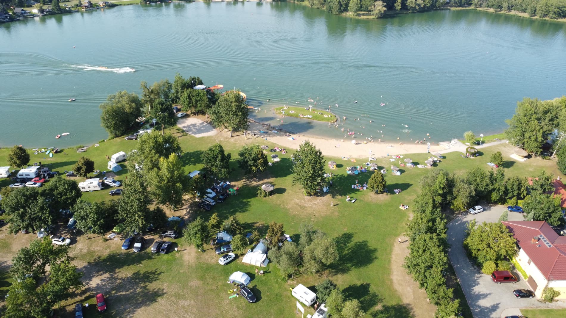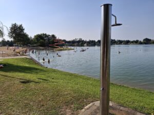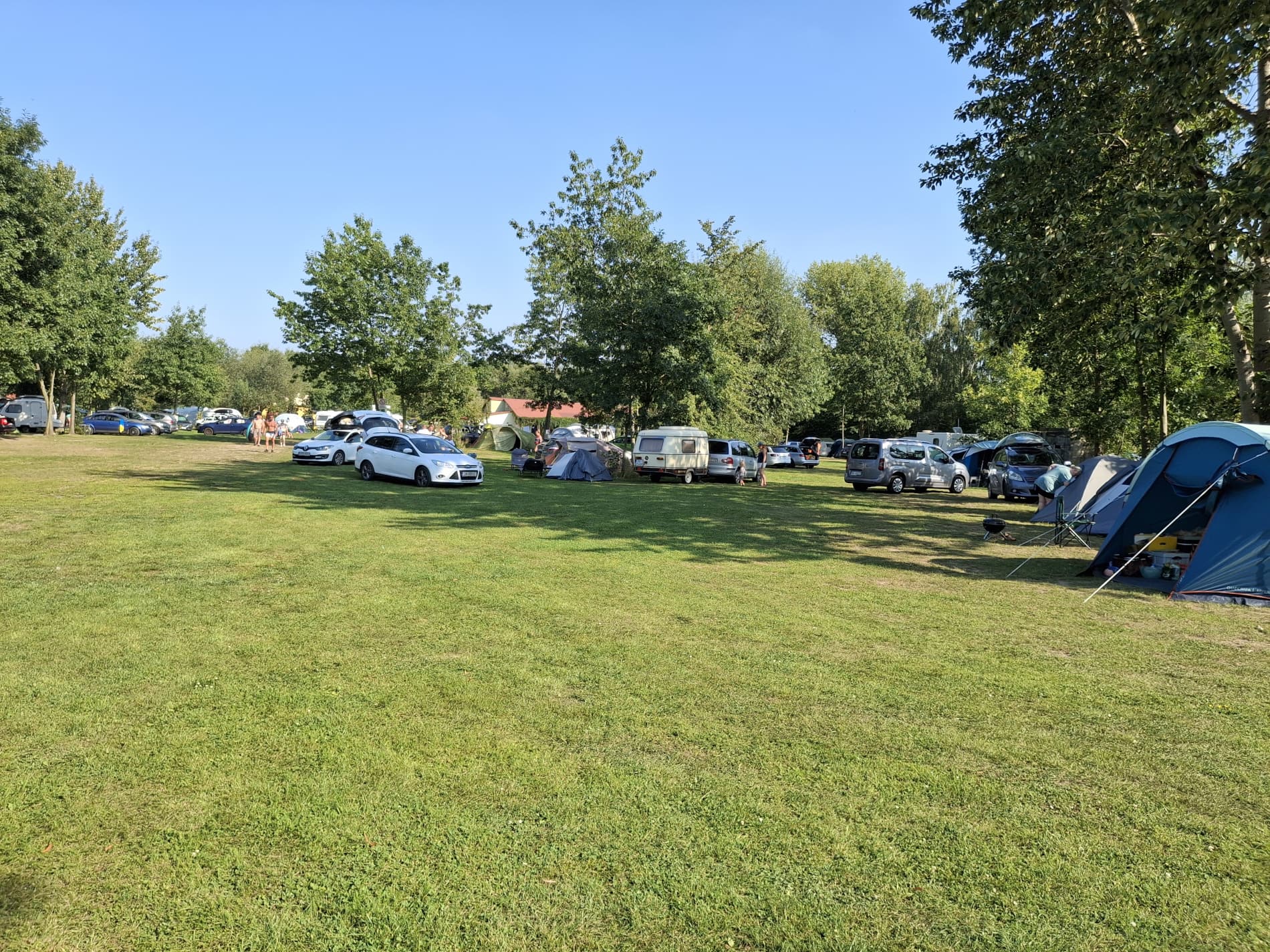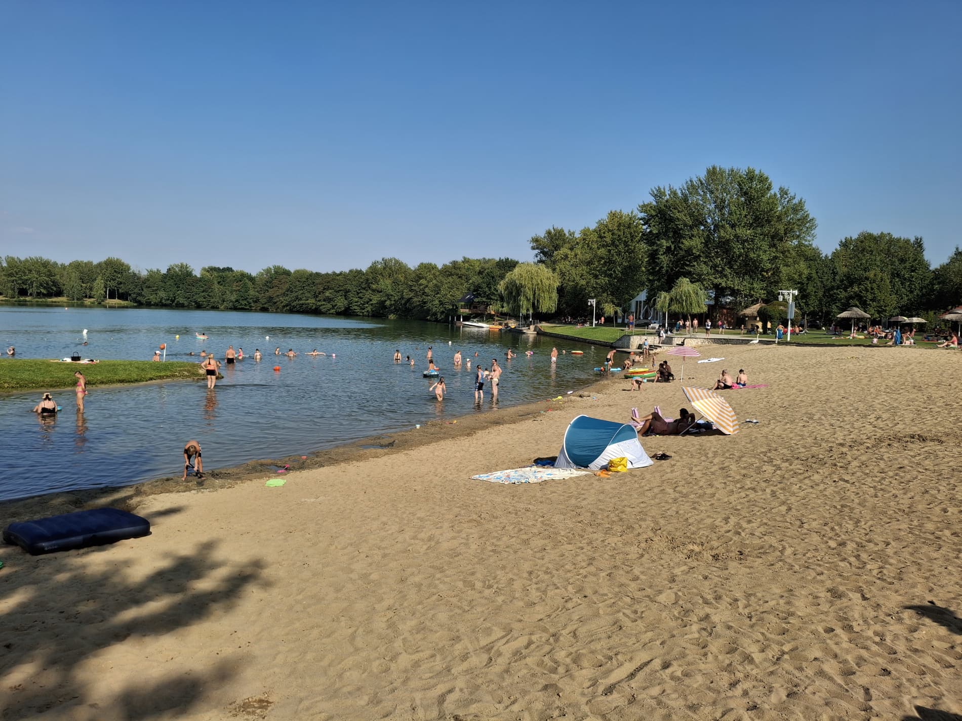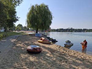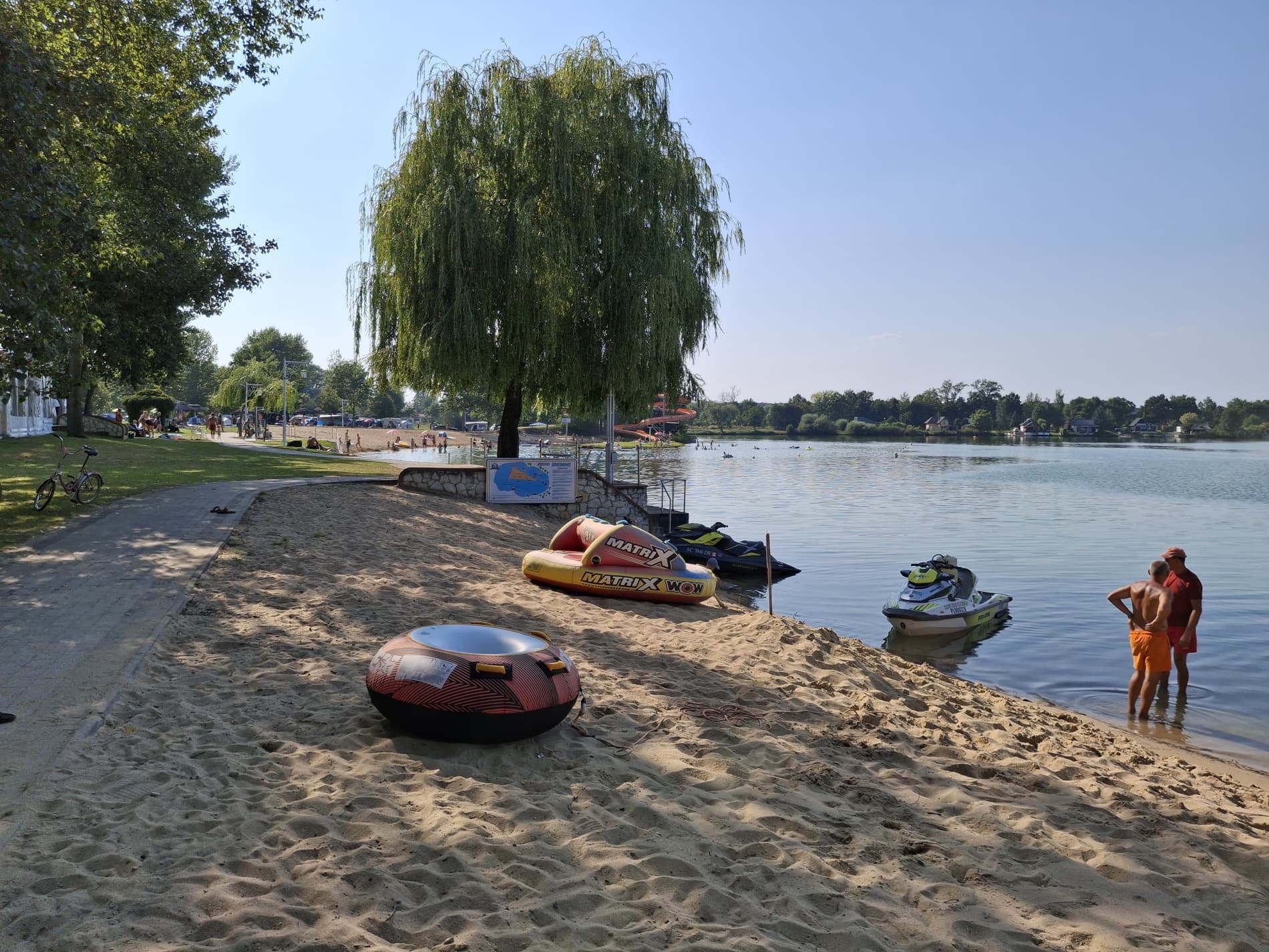 Na tyłach plaży jest boisko do siatkówki plażowej. Południowo-zachodnia część ośrodka to duże pole namiotowo-kempingowe, a przy nim kolejna, nieoficjalna plaża, służąca do okazjonalnych kąpieli oraz wypływania deskami SUP. W cenie wstępu do ośrodka jest: korzystanie z kąpieliska i zjeżdżalni, toalet i zlewozmywaków. Cała reszta jest dodatkowo płatna: noclegi, namioty, śmieci, prąd, wędkowanie, pływanie na własnym sprzęcie, czy też kiepskiej jakości prysznic na żetony. Cały teren ośrodka jest wysprzątany, a trawa przystrzyżona.