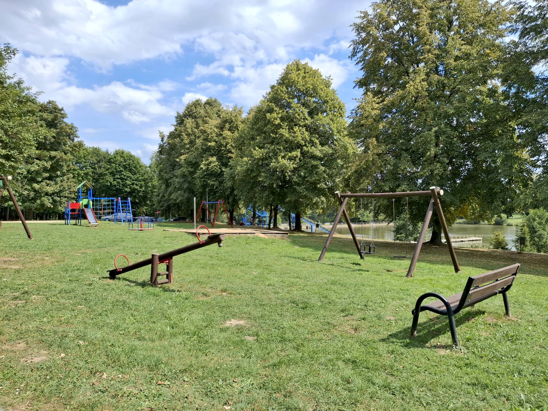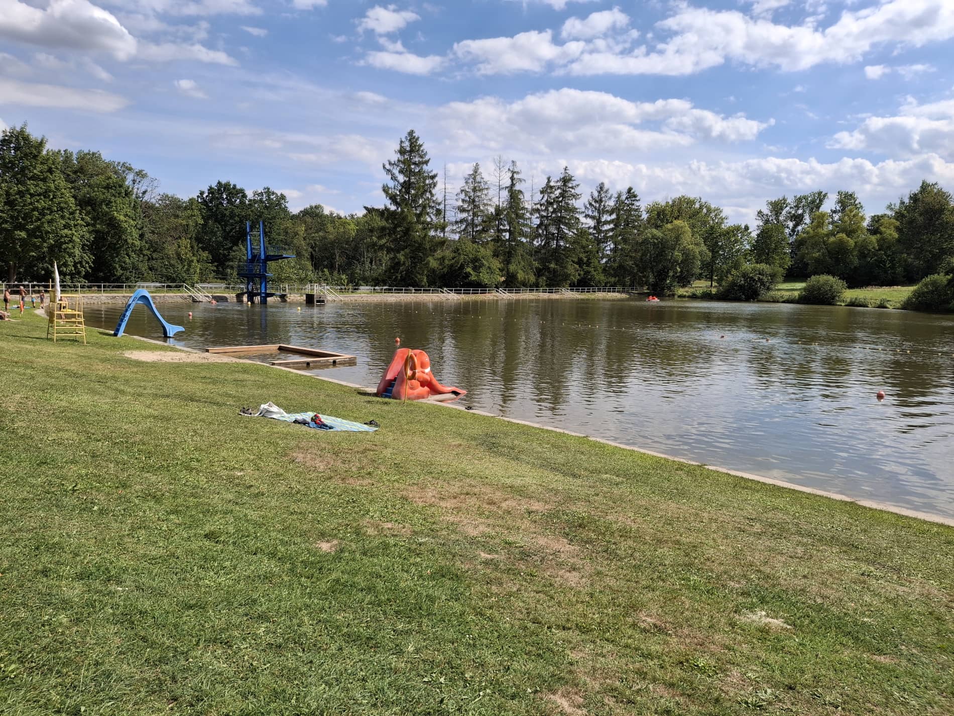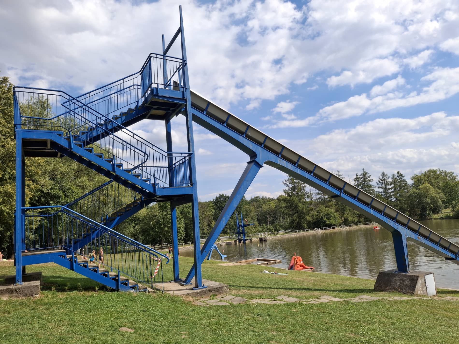 Przy kąpielisku wyróżniają się dwie monumentalne budowle. Pierwsza to skocznia (czyli coś bardzo rzadko spotykanego w dzisiejszych czasach). Ma ona 3 stopnie: 1, 3 i 5 metrów. Po drugiej stronie plaży jest 25-metrowa zjeżdżalnia, niestety jej stan techniczny jest kiepski i jest duża szansa, że będzie ona zamknięta. W centralnej części kąpieliska jest strefa dla dzieci z dwoma malutkimi zjeżdżalniami oraz „brodzikiem”, czyli płytkim terenem, ogrodzonym murkiem od reszty zalewu.