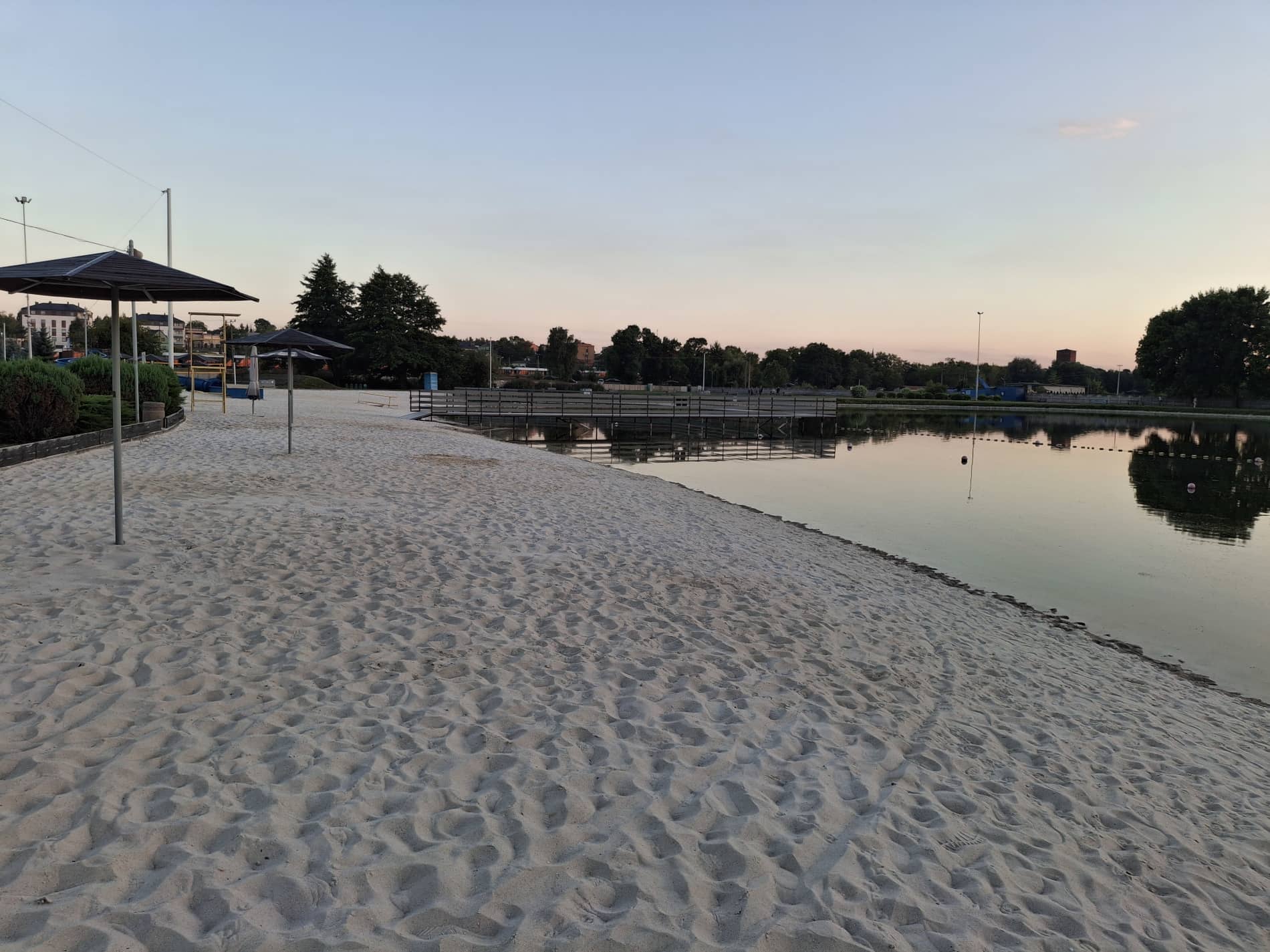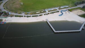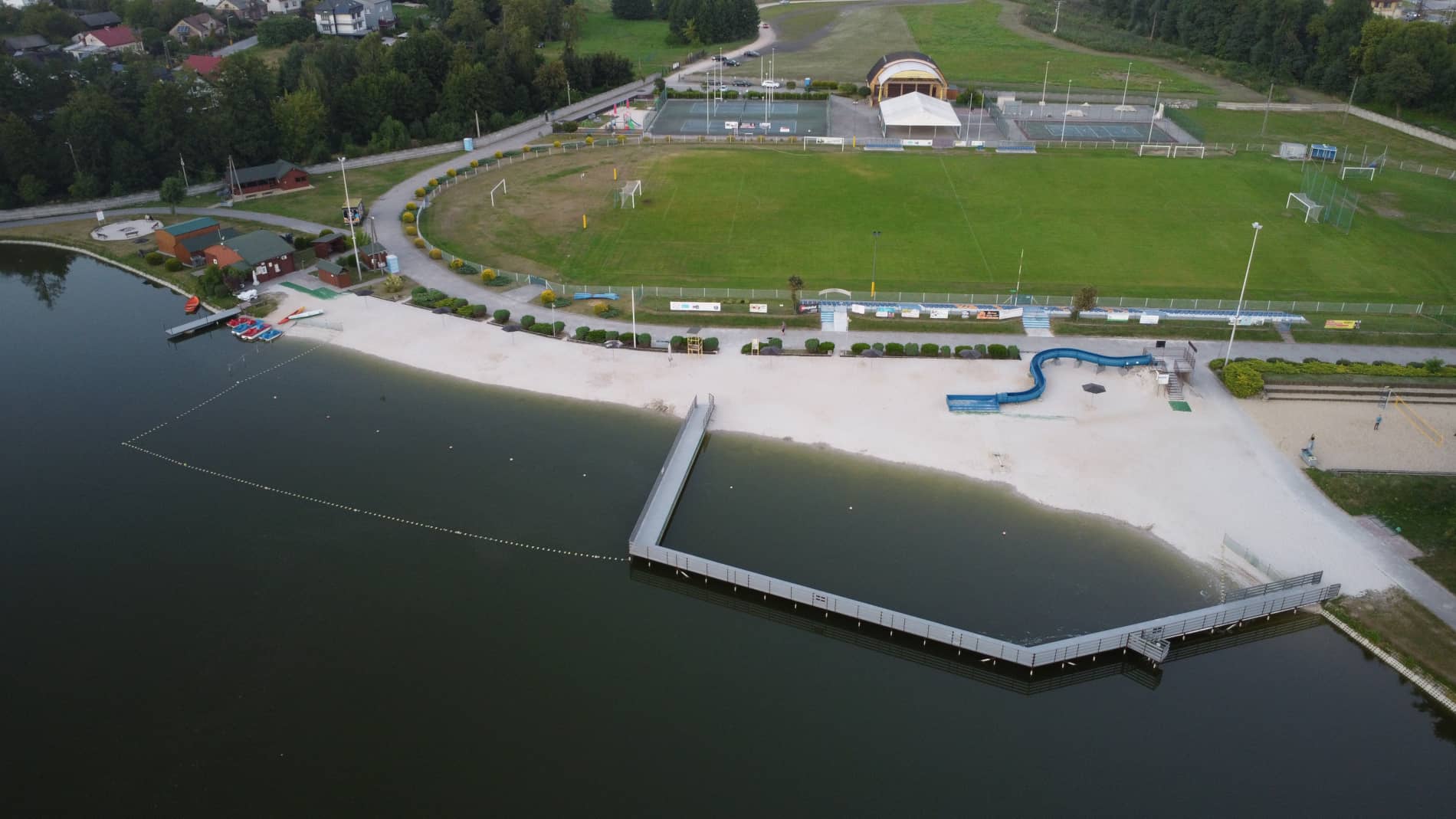 Kąpielisko funkcjonuje w wakacje letnie (lipiec-sierpień) w godzinach 11-19. Wtedy strzeżone jest ono przez ratowników WOPR. Poza sezonem oraz poza godzinami otwarcia kąpiel również jest możliwa, ale na własną odpowiedzialność. Zimą spotkać można tutaj „morsów”. Piaszczysta plaża ma długość około 110 metrów. Pierwsza część kąpieliska znajduje się wewnątrz spacerowego, drewnianego pomostu, a druga na północ od niego (są tam dwie strefy, oznaczone kolorowymi linami). Woda jest dosyć płytka, dno jest piaszczyste, ale po kilku metrach od brzegu coraz bardziej muliste. Teren zewnętrzny służy do pływania rowerkami wodnymi, kajakami i łódkami, które można wypożyczyć. Pływanie za zewnątrz oznaczeń jest możliwe na własną odpowiedzialność, ale przy dużej liczbie ludzi może nie spodobać się to ratownikowi. Obok plaży jest zjeżdżalnia rurowa, jej koniec prowadzi do specjalnej wanny na plaży (nie do wód zalewu). Sanitariaty to toalety przenośne typu Toi-Toi, jest też lepsza ubikacja z bieżącą wodą, ale wstęp jest płatny (tanio). Na terenie kąpieliska obowiązuje zakaz wprowadzania zwierząt. W pobliżu kąpieliska nie ma „stałej” gastronomii, poza automatami z przekąskami i napojami. W letnie, ciepłe dni na terenie TKR pojawiają się jednak mobilne punkty sprzedaży lodów, napojów, gofrów czy fast-foodów. Obok kąpieliska jest przebieralnia i punkt informacyjno-kasowy, w którym można wynająć rowerek wodny, parasol, leżak, piłkę, rower (zwykły i typu gokart), kort tenisowy, wiatę grillową czy miejsce na namiot.