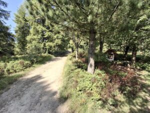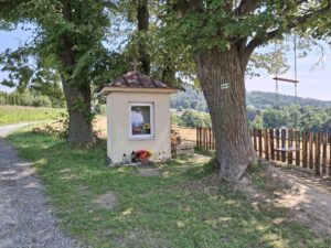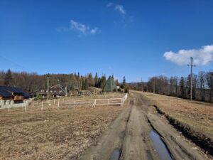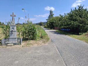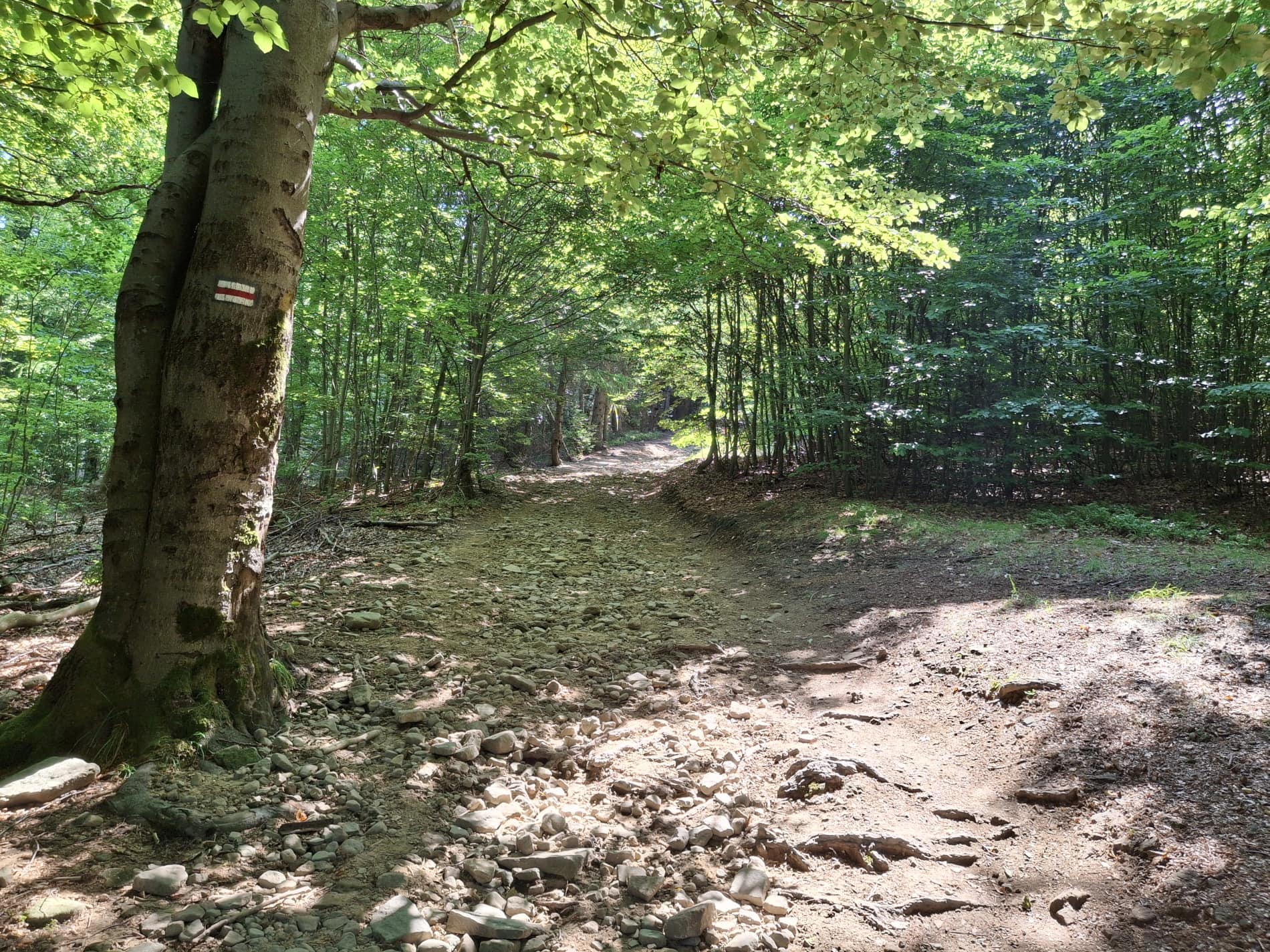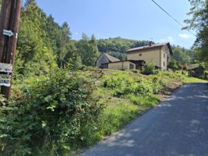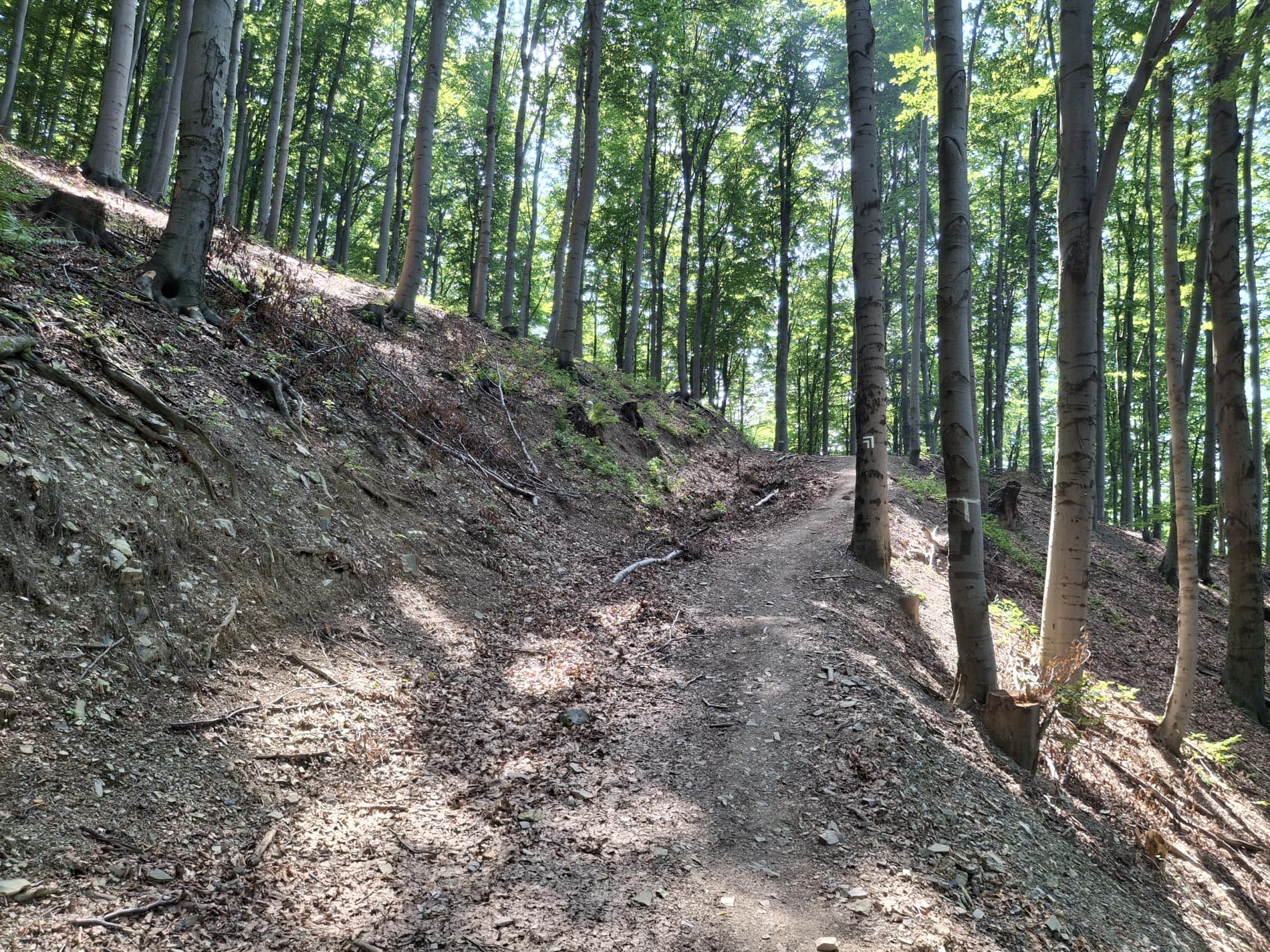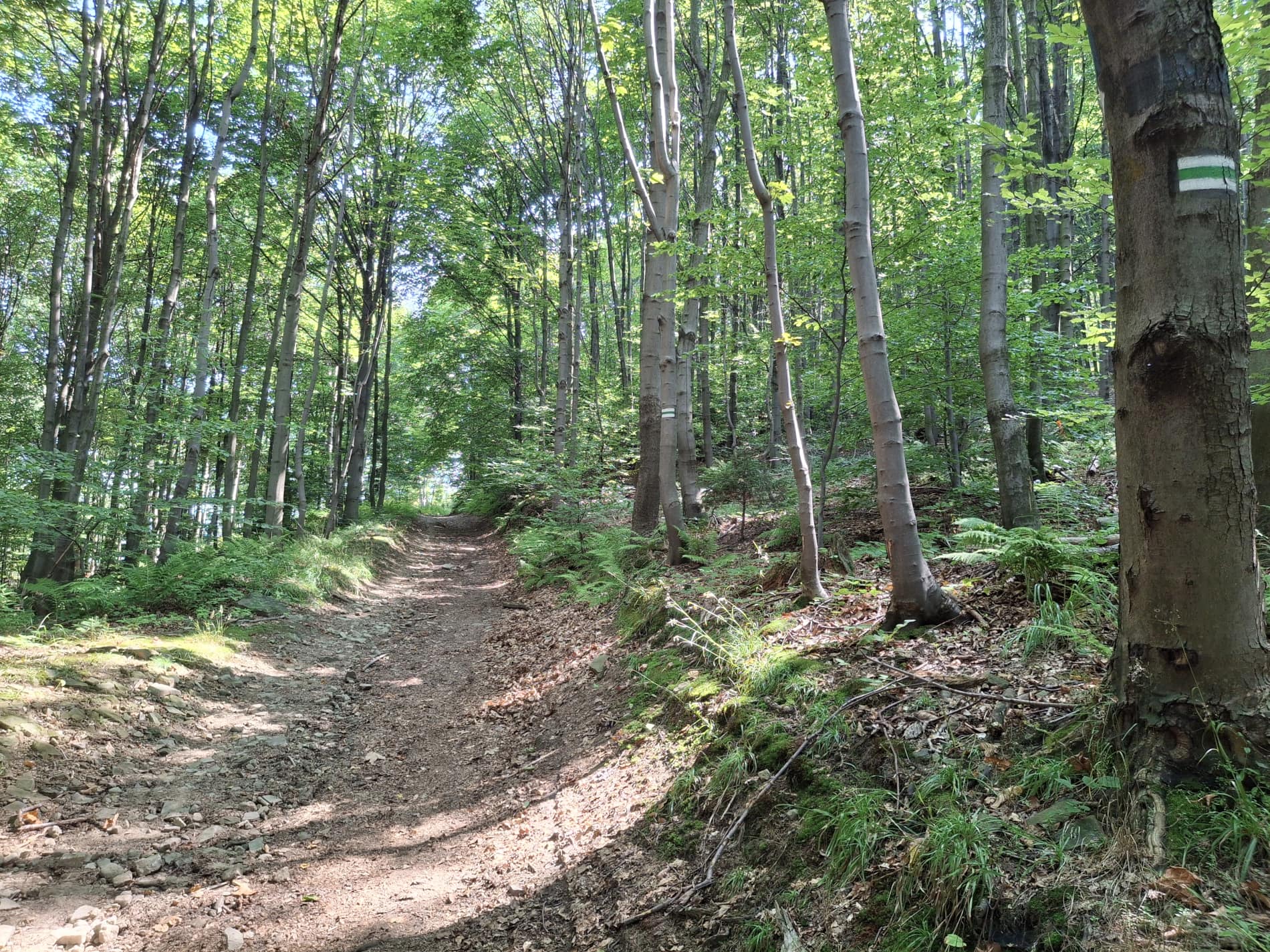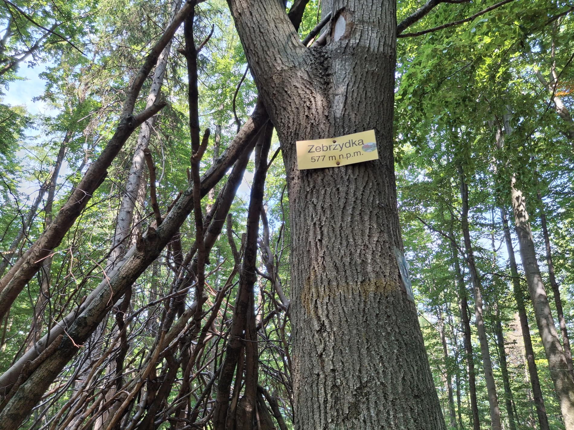 Startujemy z centrum Górek Wielkich. Najpierw trzeba przejść przez całą długość asfaltowej ulicy Pod Zebrzydkę. Od początku wiedzie ona pod górę, z czasem coraz mocniej. Po minięciu dwóch kapliczek (fot.4 i 5) uzyskamy pierwsze widoki w stronę południową (fot.5). Idąc ulicą dalej (fot.7) dojdziemy do ważnego skrętu w prawo (fot.8). Dawniej szlak prowadził prosto, ale w wyniku korekcji właścicielskich terenu- teraz trzeba iść w prawo, aby po chwili (przed domem na fot.8) skręcić w lewo. Następnie szlak wchodzi w gęsty las (fot.9) i robi się jeszcze bardziej stromy- to podejście pod Zebrzydkę (fot.10). Jest to jedno z trzech największych podejść na całej trasie. Szczyt Zebrzydki można na upartego obejść od północy „wirtualnym” szlakiem niebieskim, wówczas jest znacznie łatwiej, ale przyda się aplikacja z mapami GPS, bo nie ma na tym etapie oznaczeń na drzewach. Kulminacja podejścia pod Zebrzydkę szlakiem zielonym (fot.11) jest bardzo stroma (miejscami ponad 35%) i trzeba tam bardzo uważać, zwłaszcza zimą i podczas deszczu. Szczyt Zebrzydki (fot.12) nie jest miejscem widokowym i turystycznym, nie ma tam nawet ławeczki, jedynie tablica. Za szczytem Zebrzydki szlak zielony wiedzie w dół (fot.13, w sumie około 65 metrów zejścia pionowego na niecałych 600 metach dystansu). Za zejściem szlak od razu funduje kolejne mocne podejście pod górę (fot.14). Po około 700 metrach dojdziemy do przełęczy „Pod Łazkiem” (fot.15 i 16). Jest to widokowe i ważne miejsce, gdyż nasz szlak zielony w tym miejscu się kończy, a dalszą trasę kontynuować będziemy szlakiem czerwonym (prowadzącym na Błatnią od strony Jaworza-Nałęża).