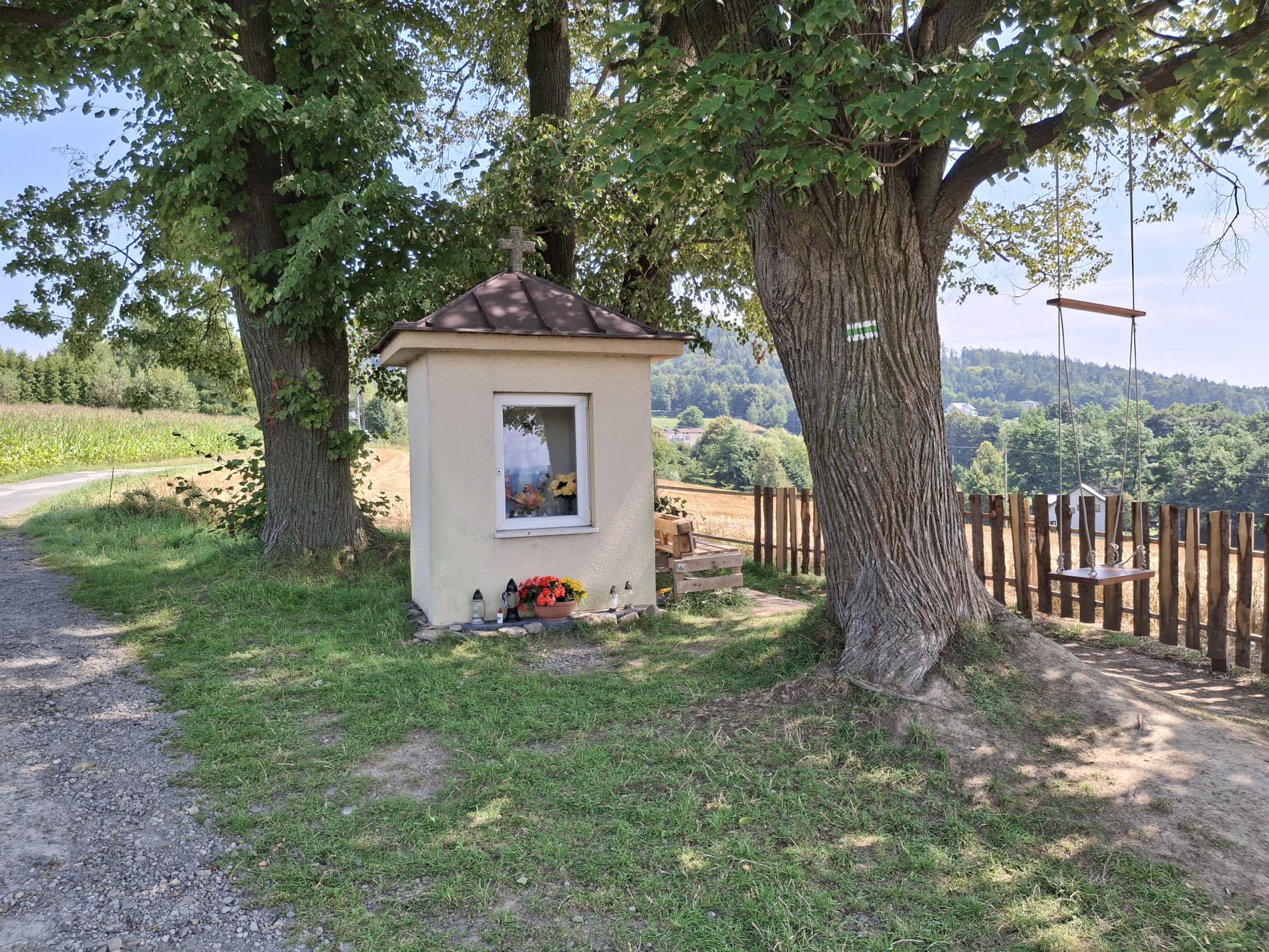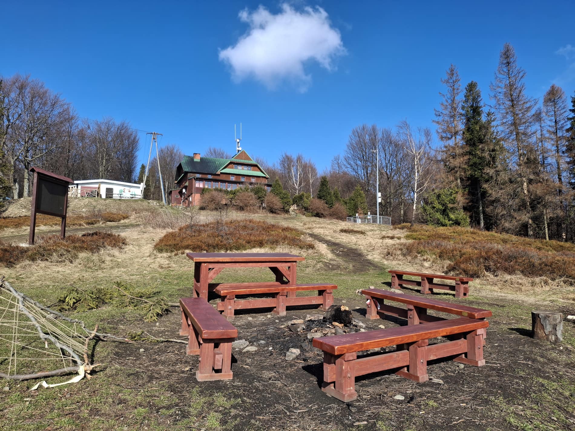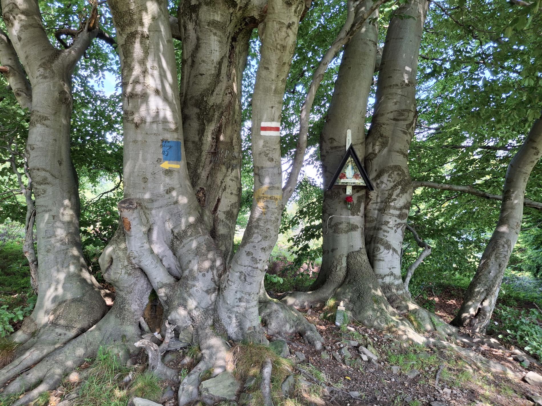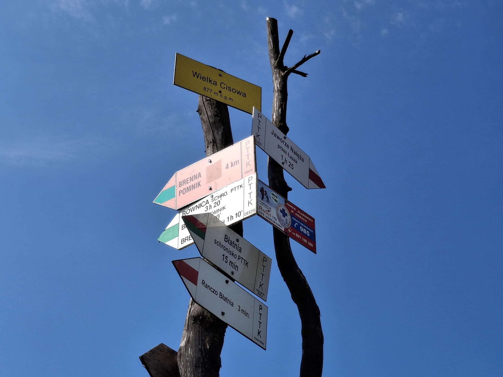 Za „Łazkiem” szlak czerwony jest nieco odkryty i słoneczny (fot.17), gdzieniegdzie przebijają się widoki na wschód (fot.18). Początkowo podejście jest niewielkie (od kilku do kilkunastu procent), a za Czuplem nawet lekko w dół. Z drugiej strony Czupla kończy się szlak myśliwski z Brennej-Spalonej (fot.19). Ma on również kolor czerwony, ogólnie w tej okolicy zaobserwować można szlakowy bałagan- wiele szlaków tego samego koloru spotyka się ze sobą (jedynie żółty jest jeden), inne istnieją na mapach, ale nie są malowane na drzewach. Po minięciu szlaku myśliwskiego czeka nas trzecie i ostatnie strome podejście- na Mały Cisowy. Ma ono około pół kilometra długości i 100 metrów przewyższenia. Za Małym Cisowym jest już łatwizna. Szlak jest głównie płaski (fot.20) i później wiedzie przez coraz bardziej otwarte przestrzenie (fot.21 i 23), już do Błatniej gęstego lasu nie uświadczymy. Często przy szlaku można spotkać kapliczki katolickie (fot.22 i 24). Przed Wielką Cisową jest krótkie i niewielkie podejście, a potem lekko w dół (fot.25). Na Wielkiej Cisowej w stronę Brennej odbija szlak zielony. Są tam oznaczenia (fot.26) oraz pomnik i tablica upamiętniająca walkę NSZ ze stalinowską milicją (fot.27 i 28). Końcówka szlaku jest łatwa, trzeba przejść przez długą polanę (fot.29 i z widok drugiej, 'końcowej’ strony na fot.32). Po drodze nasz szlak mija Ranczo Błatnia (fot.30) i kończy się przy schronisku PTTK (fot.31). Przy schronisku spotkamy kolejne szlaki: niebieski z Bielska-Wapienicy i żółty z Jaworza na Klimczok. Aby dojść na szczyt Błatniej (fot.33 i 34)- należy kilka minut iść szlakiem żółtym w stronę Klimczoka. Na szczycie są tablice i wielkie krzesło na betonowym podejście, służącym za punkt widokowy.