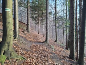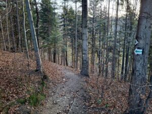 Nachylenie terenu na szlaku jest bardzo zróżnicowane: są momenty płaskie, są podejścia lekkie i ostrzejsze, są też liczne zejścia w dół.