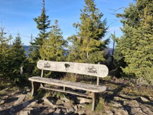 Następnie przez około 600 metrów szlak jest płaski, a miejscami wiedzie nawet lekko w dół (fot. 11 i 12). Prześwity przez drzewa fundują nowe widoki, w stronę Malinki. Nachylenie z czasem stanie się wyraźniejsze, a szlak kilka razy ostro zakręci. Za ostatnim skrętem (ostro w lewo) droga będzie prosta, jak od linijki. Oznacza to początek podejścia pod Czupel (zwany też Czuplem Wiślańskim z powodu zbieżności nazw z kilkoma innymi górami o tej nazwie), czyli najwyższy szczyt na opisywanym odcinku szlaku (882 m.n.p.m.) Niestety, z niewiadomych przyczyn szlak zielony nie przechodzi przez sam szczyt, lecz omija go bokiem, po wschodniej stronie. Iść szlakiem zielonym i nie wejść na Czupel to tak, jakby pojechać do Paryża i nie zobaczyć Wieży Eiffela. Drogi na Czupel są dwie: północna i południowa. Północna jest oznakowana (fot.16), ale idąc pod górę (od strony Wisły) musimy nieco wrócić z powrotem (nadrabiając około 200 metrów w jedną stronę). Droga południowa jest nieoznakowana, więc warto posiłkować się mapami z telefonu (bez nich lepiej iść drogą północną). Na zakręcie ze zdjęcia nr14 trzeba iść prosto, a nie skręcać w prawo. Na szczycie Czupla (fot. 17 i 18) jest punkt widokowy z solidną ławką i tablicą panoramiczną. Nie ma zresztą miejsca na nic więcej, bo płaskiego miejsca jest niewiele, a nazwa Czupel nieprzypadkowo oznacza ostry wierzch. Widok jest świetny, m.in. na Skrzyczne, a przy dobrej pogodzie nawet na Małą Fatrę.