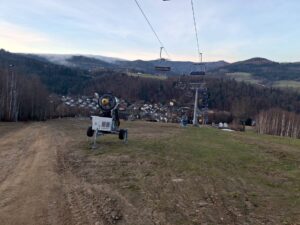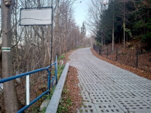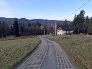 Zaczynamy na południowym końcu ulicy Na Stoku. Po przejściu mostem przez Wisłę (fot.4) szlak wiedzie ulicą z betonowych płytek (fot.5). Po chwili miniemy dolną stację ośrodka narciarskiego, a szlak skieruje się w stronę stoku (fot.6). W okolicy ośrodek (rozszerzając ofertę na sezon letni) wytyczył kilka downhillowych tras rowerowych, ale są one odseparowane od ruchu pieszego, jednak w górach zawsze trzeba zachować czujność. Następnie szlak przecina stok narciarski (fot.7) i przechodzi na jego zachodnią stronę. Jak pisałem wyżej- w dniach „narciarskich” nie przejdziemy tędy i trzeba zacząć wędrówkę z drugiej strony, ulicą Wróblonki. Po przejściu na drugą stronę stoku dojdziemy właśnie do ulicy Wróblonki (fot.8), wyłożoną znajomymi betonowymi płytkami. Następnie szlak przechodzi przez osiedle (głównie nowszych) domków (fot.9), część z nich jest do wynajęcia krótkoterminowego. Za tymże osiedlem, u stup góry Grapa jest górna stacja wyciągu (fot.10), a szlak żegna się z cywilizacją. Dalsza część (już do samego końca) to klasyczna ścieżka górsko-leśna.